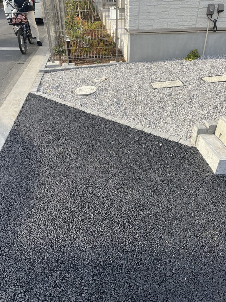 また、公道からの侵入部分に隅切り施工を行って、車の入出庫をスムーズにしました。この施工により見通しが良くなり、車や歩行者との事故リスクを低減します。